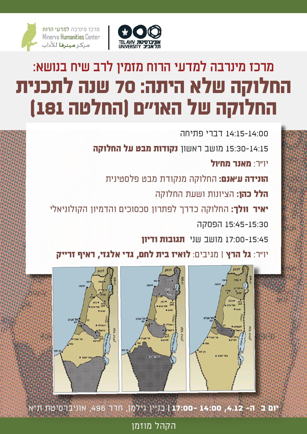 The Living Together research group and the MHC invites you to a symposium concerning the UN partition plan (resolution 181), which will be held on Monday, December 4th 2017, 14:00 - 17:00, at Tel Aviv University, Gilman Building, Room 496. Admission is free, the public is invited.